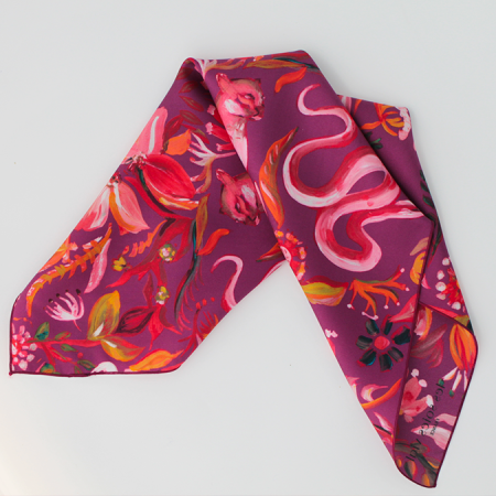 search Quick view Add to cart Tina, purple little silk... Price €39.00 Our small silk square in shades of purple/red/orange. The Tina silk square evokes panthers and snakes in a floral setting. This silk scarf...