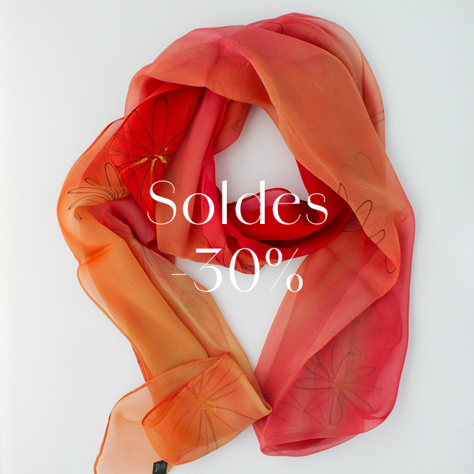 The width and length of this stole allow it to be tied elegantly around the neck or simply draped over the shoulders.Made from beautiful silk muslin, it offers a fluid and transparent texture, providing enveloping warmth while remaining extremely lightweight.This scarf is entirely made in France: woven in the Loire region by a high-end weaving company, hand-painted in our workshop, then carefully crafted near Lyon.