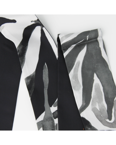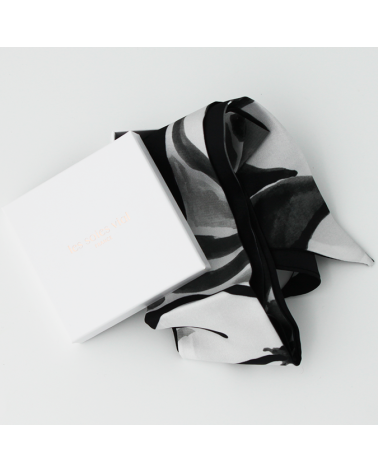 This silk accessory is reversible: one side is painted with grey, black and white foliage, the other has a contrasting deep black background.This accessory is made in France: designed in our workshop, printed and manufactured in the Lyon region.