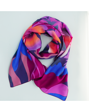 Add some flair to your outfit with this 70s-inspired silk scarf, which subtly blends deep hues with bright accents.