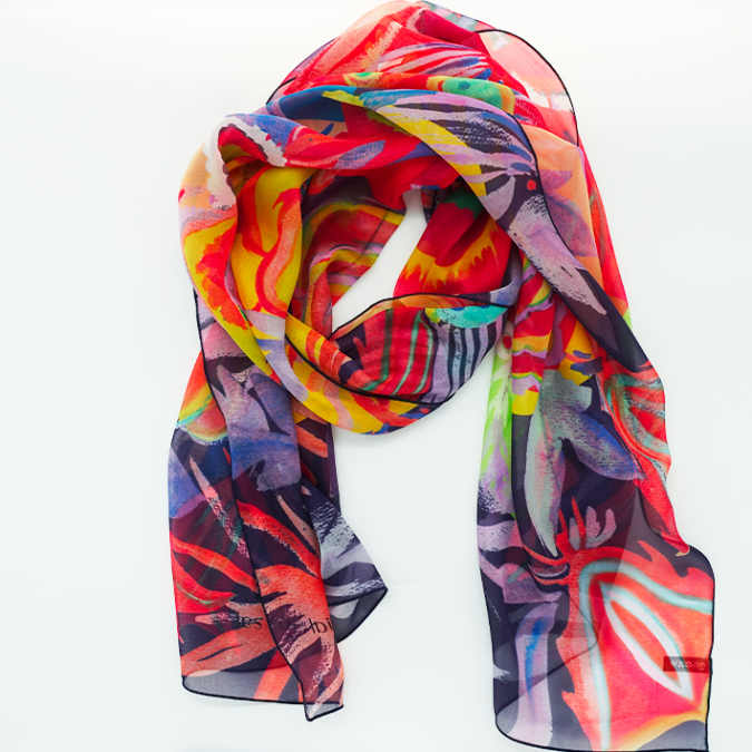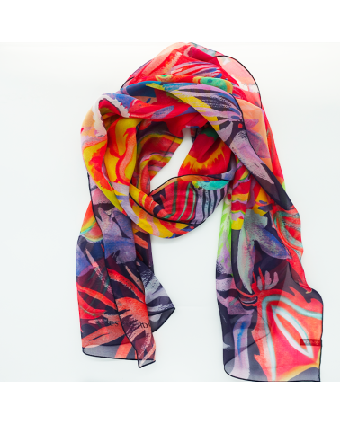 This vibrantly colored shawl can be worn draped delicately over the shoulders or wrapped around the neck. Crafted from silk chiffon, it captivates with its lightness, fluidity, and subtle sheerness.