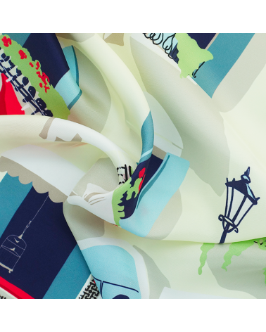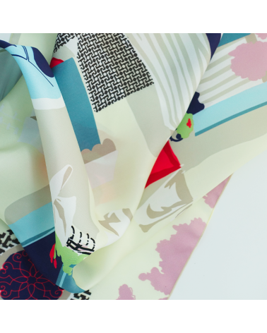 Enhance your style with this women’s silk scarf featuring a beige background and a contemporary Mediterranean pattern inspired by a southern façade.
