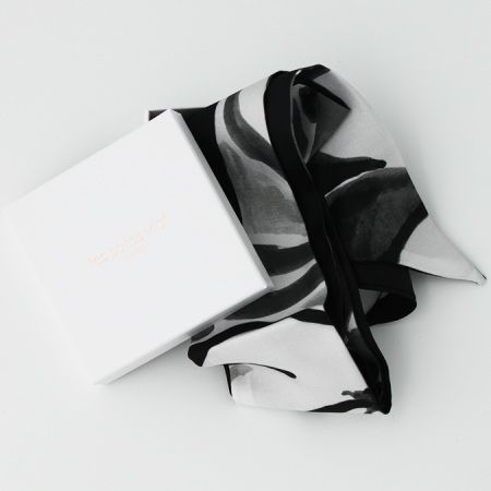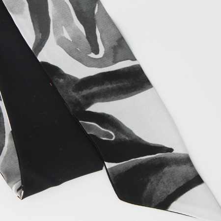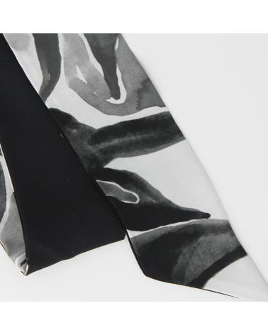 Cet accessoire en soie est réversible : d'un coté est peint un feuillage gris noir et blanc, de l'autre un fond noir intense pour contraster.