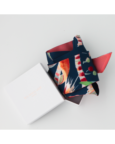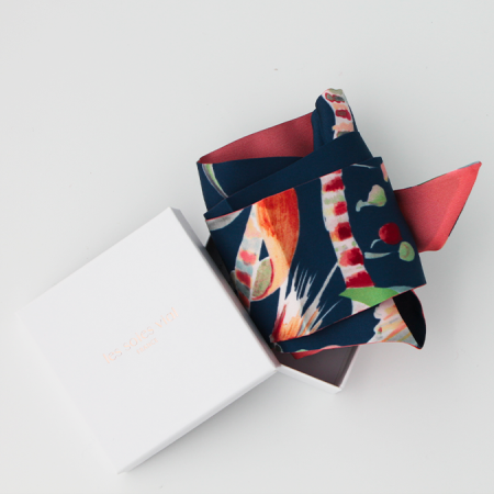 Le bandeau de soie bleu marine et rose dans son beau coffret cadeau.
