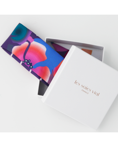 Dessiné dans notre atelier, cet accessoire en soie est ensuite imprimé et confectionné en France en région Rhône Alpes.