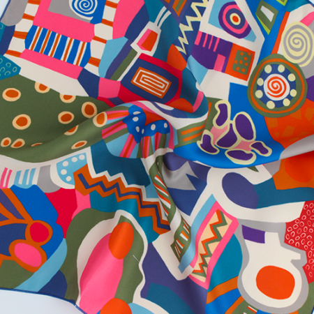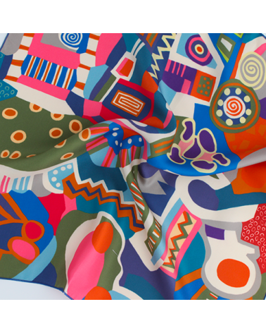 Un petit carré de soie multicolore au motif abstrait et contemporain.