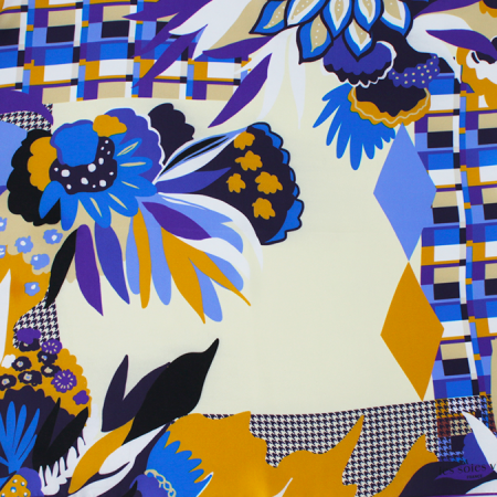 Notre petit carré de soie bleu et jaune d'or sur fond crème.