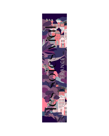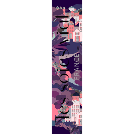 Foulard en soie aux maisons roses, violette et bleus.