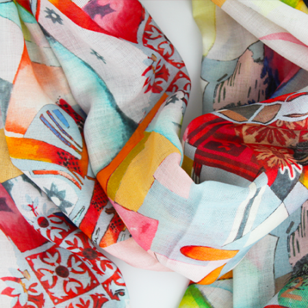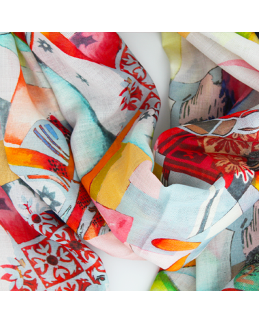 Chaque étole est tissée en Italie avec une exigence de qualité irréprochable, puis dessinée dans notre atelier et imprimée et confectionnée, autour de Lyon, réputée pour son expertise textile.