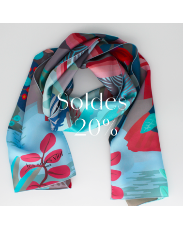 Dessinée dans notre atelier, cette écharpe a ensuite été imprimée et confectionnée avec soin dans la région lyonnaise, en France.