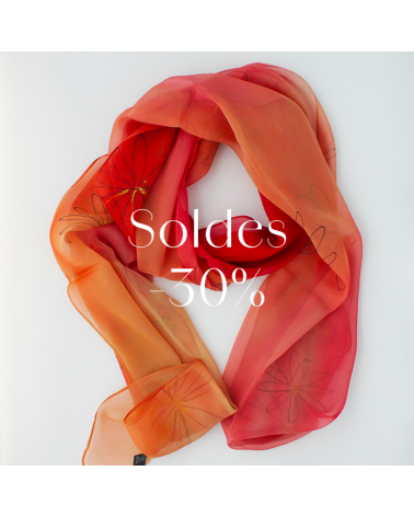 Notre étole en mousseline 100% soie orange brique est peinte à la main dans notre atelier.